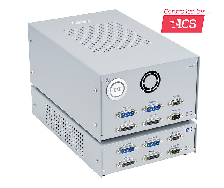 G-910.RC0242100 and G-910.RC0242200 ACS motion controllers with 24 V and 48 V intermediate circuit voltage and interfaces for PI positioners